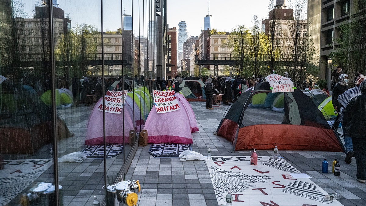 New York University students set up an encampment in solidarity with Gaza as police stand guard on April 26, 2024, in New York City. A previous encampment was dismantled by NYPD and in a compromise with administrators, students took down tents but continued to occupy the public space as a solidarity encampment. (Stephanie Keith/Getty Images)
