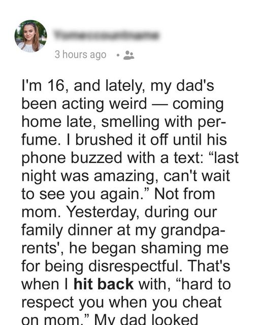 As I got older (Iโm 16 now), I started noticing my Dadโs weird behaviour. I remember a few months ago he came home super late and I could smell a little perfume on him. I didnโt really think much of it until he left his phone on the table one day and a text notification popped up saying โlast night was amazing, canโt wait to see you againโ and a bunch of cringey emojis. I was pretty shocked when I saw that message, not gonna lie. I told my Mom about what I saw and she didnโt look surprised at all. She got pretty emotional, which I felt bad about, and told me not to worry and that I should just focus on being a kid and let her take care of the rest, so I let it go because I didnโt want to hurt her more.