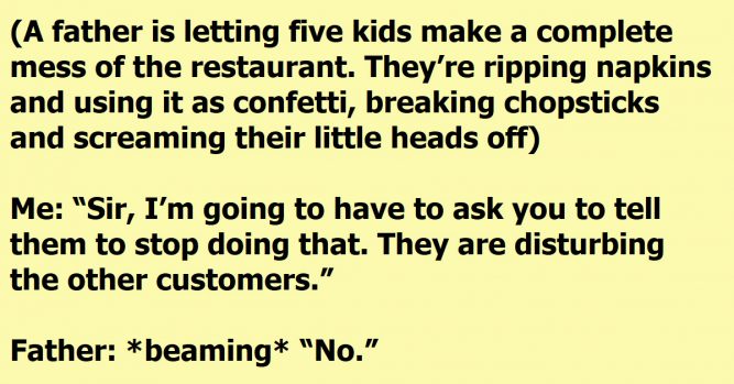 Picture this: A father is letting his five children run wild in the restaurant. They’re tearing napkins and throwing them like confetti, breaking chopsticks, and screaming at the top of their lungs.