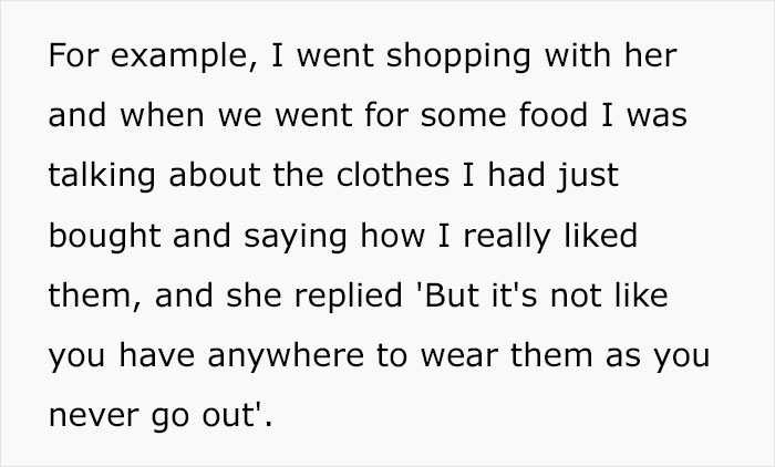 For example, during a shopping trip, the daughter showed her some newly bought clothes, to which the mom responded, “It’s not like you have anywhere to wear them as you never go out.” This left the daughter feeling hurt and judged. Everyone has different ideas of what “going-out clothes” look like, and it was simply mean for the mother to judge her choice.