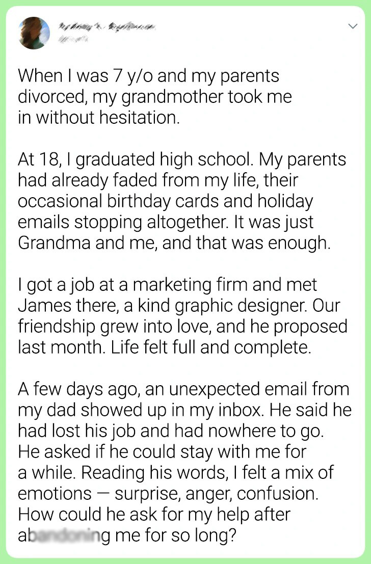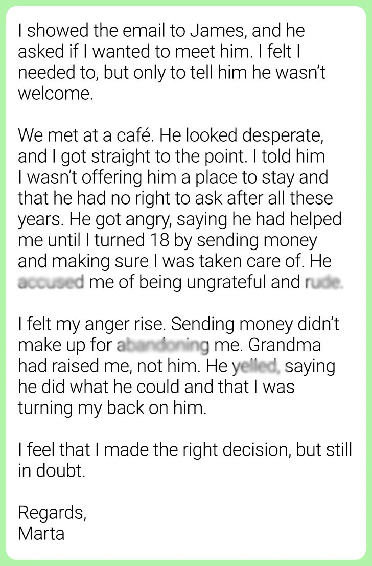 Marta’s early years were quite challenging after her parents divorced unexpectedly when she was just seven. Thankfully, she found a loving home with her grandmother, where she thrived, finishing school, falling in love with James, and building a successful career. But her tranquility was shaken when out of the blue, her estranged father sent her a startling email. Let’s dive into Marta’s story and see what lessons we can learn.