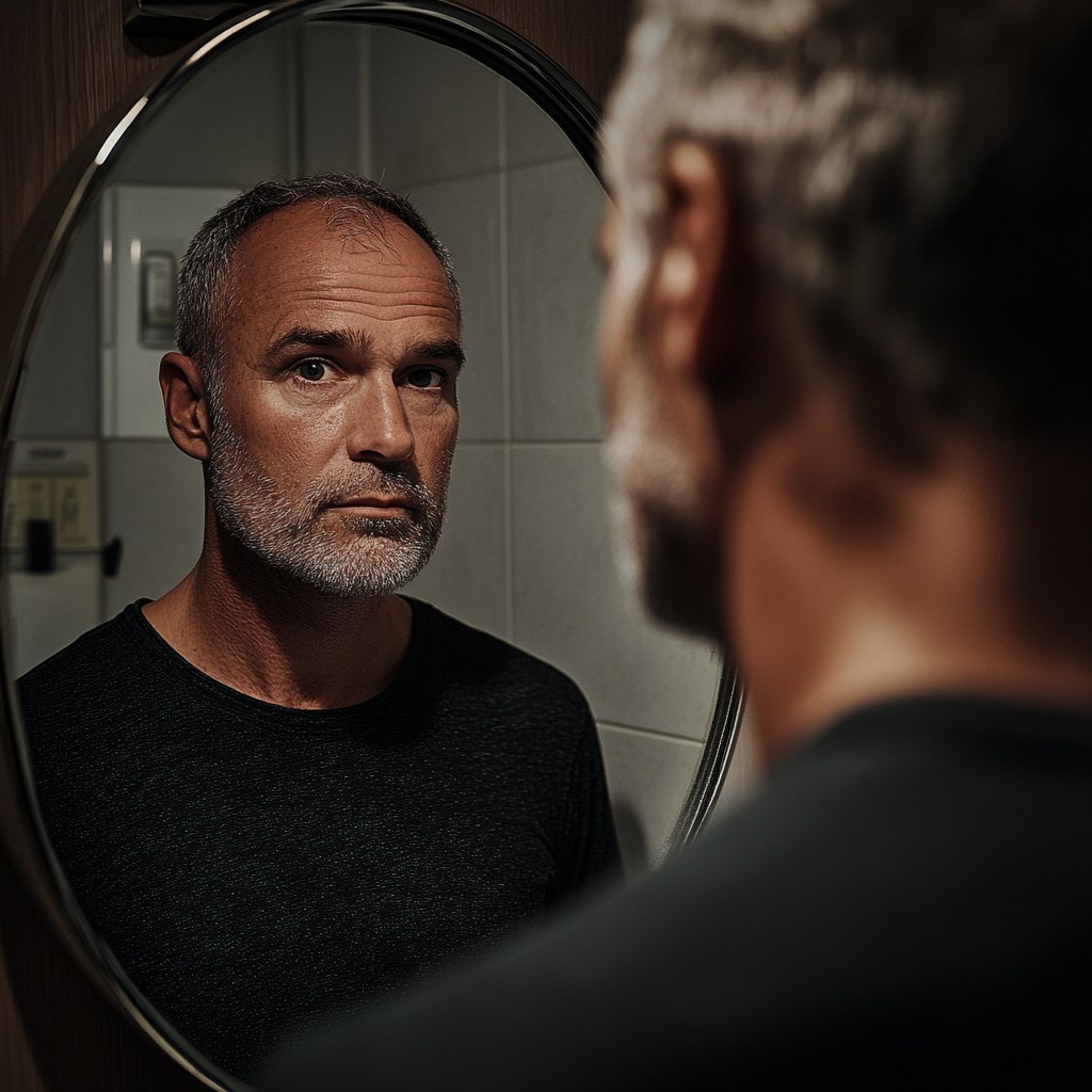 A man looking at his reflection in the bathroom mirror | Source: Midjourney