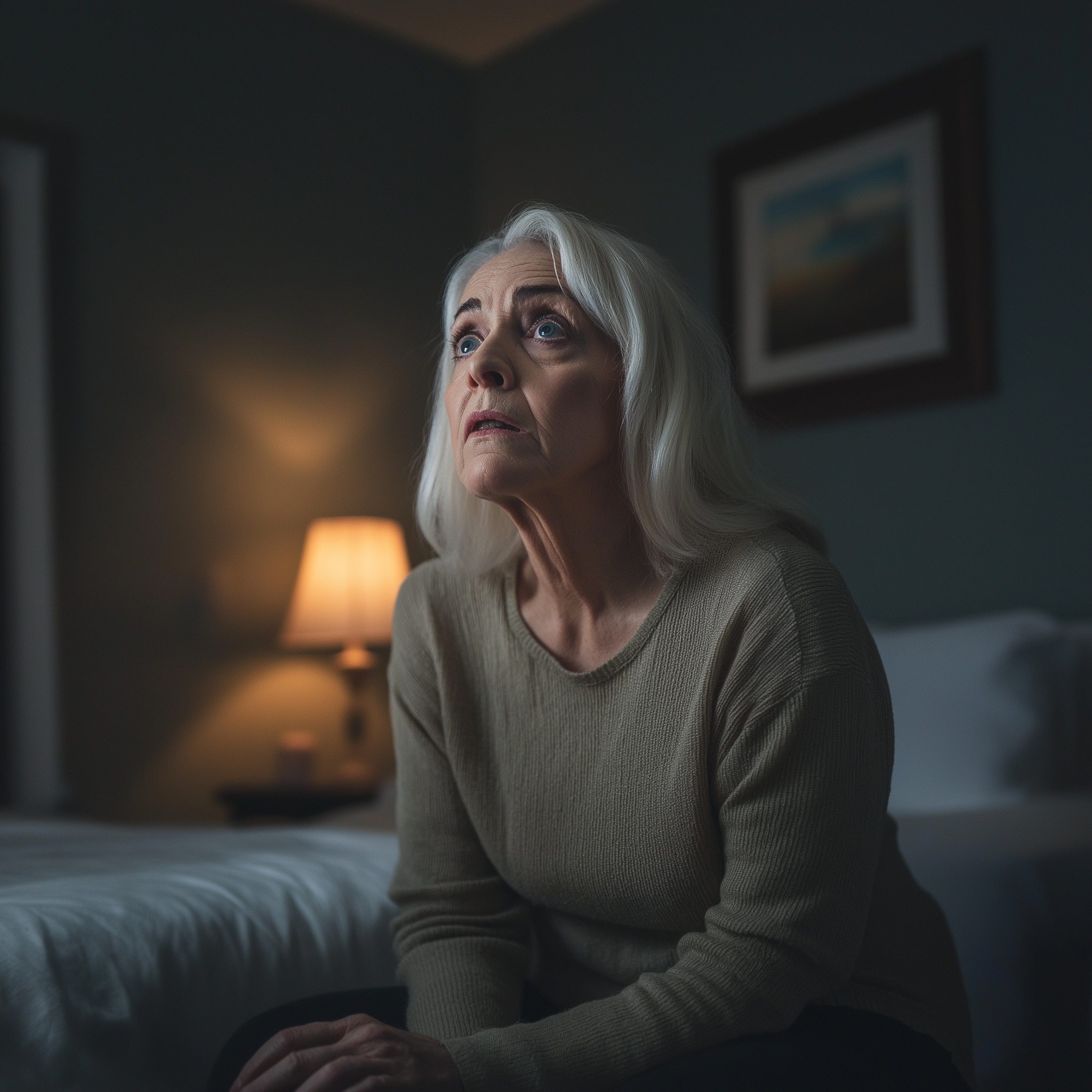 A woman looks curious and concerned while sitting in her room | Source: Midjourney