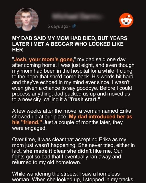 We moved into the cafรฉ, where she clutched the warm cup like it was the most precious thing in the world. I wanted answers. Where had she been? Why did Dad say she was dead? Had she abandoned me?