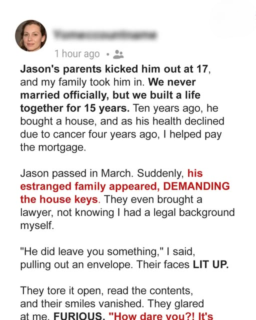 We never officially married, but that didn’t matter to us. Our love was real, and our commitment was unquestionable. Ten years ago, Jason bought a house—a small but cozy place we filled with memories. When his health started to decline four years ago due to cancer, I stepped in financially, helping him pay the mortgage while also being his primary caregiver. It was heartbreaking watching the strongest person I knew slowly wither away, but I never left his side. He passed in March, and just when I thought the worst was behind me, his estranged family suddenly appeared.