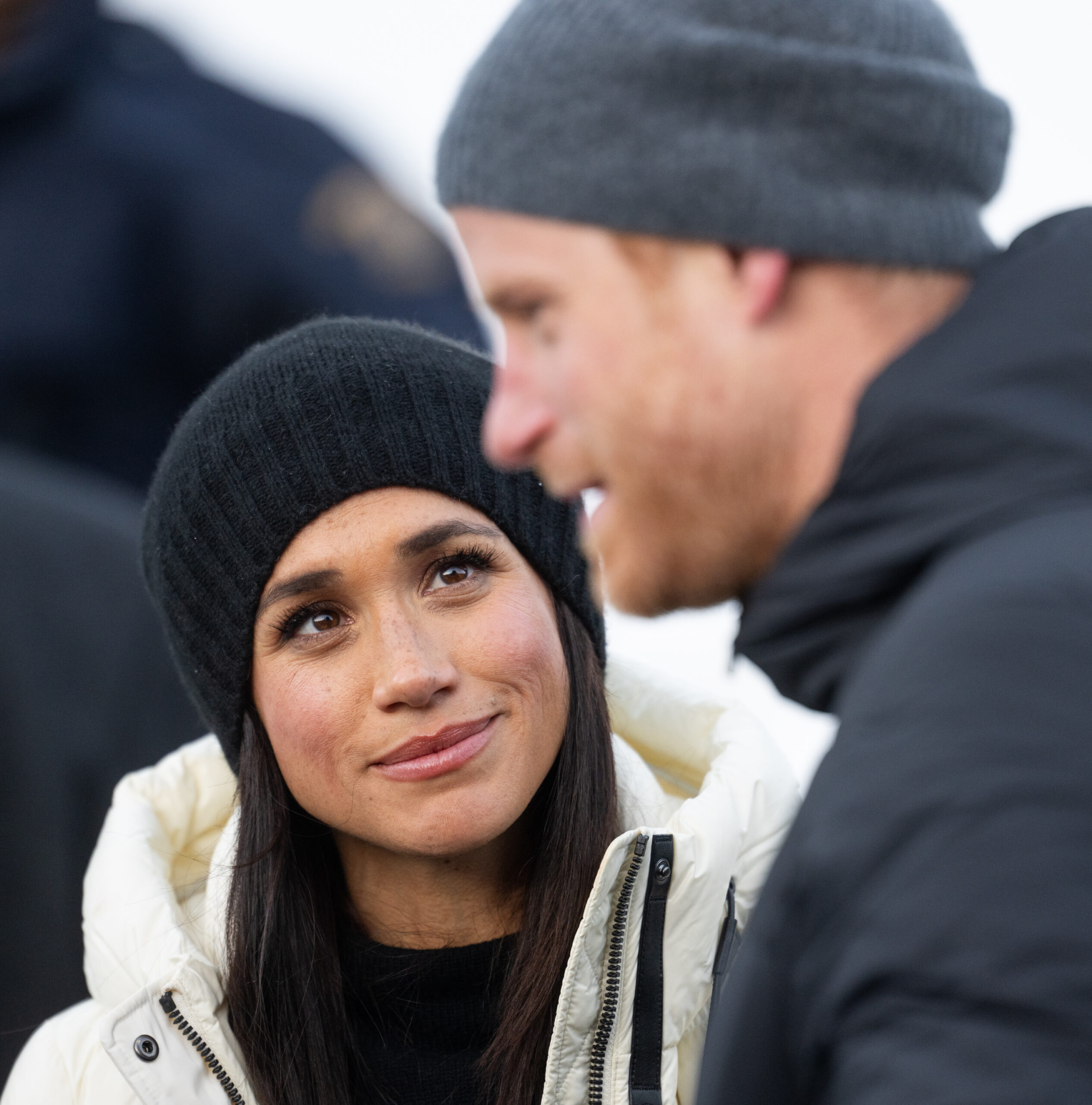 The Duchess chose a chic and practical winter outfit, consisting of a white puffer jacket bearing the initial “M” on the sleeve and a snug black beanie that added to her allure. Her long, dark tresses flowed elegantly over her shoulders, framing her radiant, makeup-free complexion.