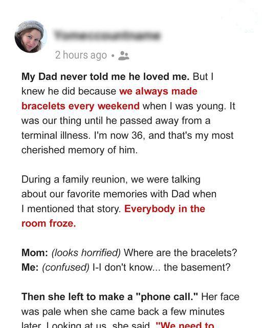 โ€œDad never told me he loved me,โ€ I started, earning puzzled looks. โ€œBut he showed it in other ways. We made bracelets together every weekend. That was our thing.โ€