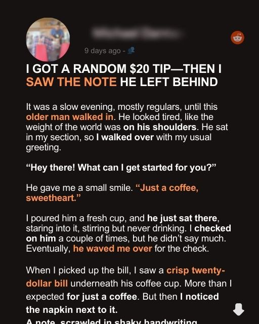 I stood there, holding that napkin like it was something sacred, because in that moment, I knew—I wasn’t just some random waitress to him. I was a memory, a reminder of someone he lost. And that $20? That was never just about a tip.