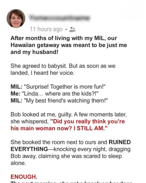 She booked the room next to ours and RUINED EVERYTHING—knocking every night, dragging Bob away, claiming she was scared to sleep alone. ENOUGH.