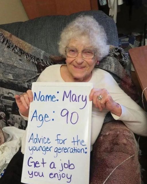 “Name: Mary Age: 90 Advice for the younger generation: Get a job you enjoy.”