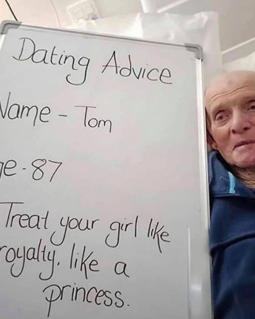 Eighty-seven, navy zip-up sweater, twinkle in his eye like he knew something you didn’t. He was holding this big whiteboard with his dating advice scribbled on it: