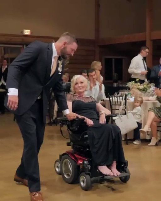 He walked across the floor in his tux, leaned down, and took my mom’s hand. She was already emotional in her chair, barefoot, her black dress perfectly draped. When he wheeled her to the center and started dancing with her—gentle, like she was made of glass—you could feel the whole room hold its breath.