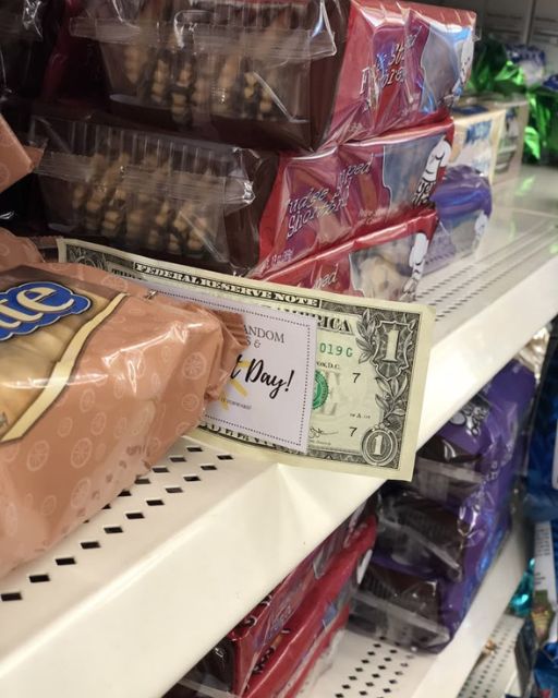 A single dollar bill tucked neatly behind a pack of shortbreads, barely sticking out. At first, I thought someone just dropped it, but then I noticed the small note clipped to it: