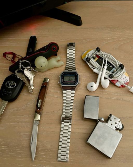 First, there’s a shiny metal watch—not the cheap kid kind, but an actual adult watch. Then I find a pocket knife (which about gave me a heart attack), a big metal lighter, and a wad of tangled earbuds. There’s a set of Toyota keys with a weird little rubber alien charm, and a whole mess of other things that definitely don’t belong to a seven-year-old. I’m standing there holding a Swiss Army knife in one hand and a lighter in the other, trying not to freak out.