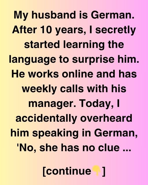 My husband is German. After 10 years, I secretly started learning the language to surprise him. He works online and has weekly calls with his manager. Today, I accidentally overheard him speaking in German, โNo, she has no clue.โ