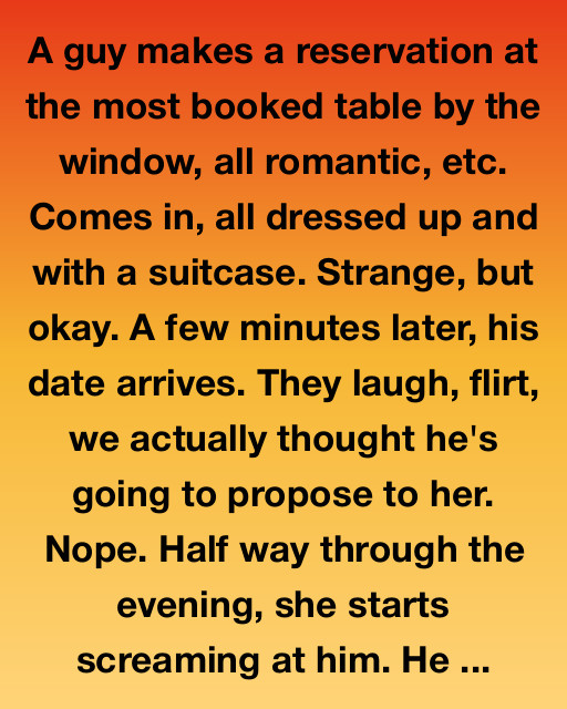 A guy makes a reservation at the most booked table by the window, all romantic, etc. Comes in, all dressed up and with a suitcase. Strange, but okay. A few minutes later, his date arrives.