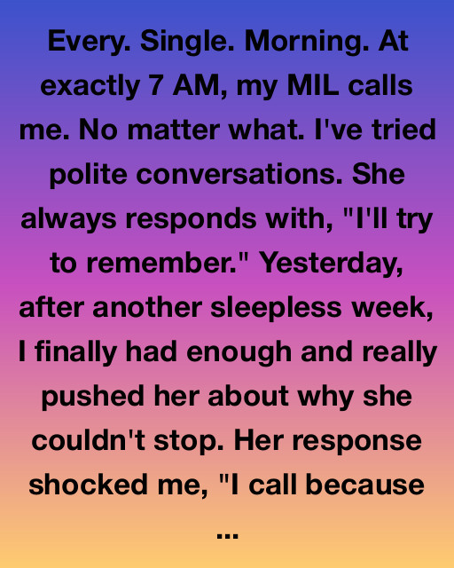 Every. Single. Morning. At exactly 7 AM, my MIL calls me. No matter what. I’ve tried polite conversations. She always responds with, “I’ll try to remember.” Yesterday, after another sleepless week, I finally had enough and really pushed her about why she couldn’t stop. Her response shocked me, “I call because I don’t want to feel like I’ve lost another son.”