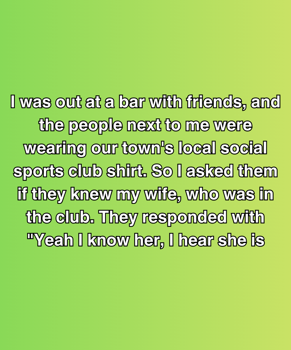 I was out at a bar with friends, and the people next to me were wearing our town’s local social sports club shirt. So I asked them if they knew my wife, who was in the club. They responded with “Yeah I know her, I hear she is”—then he stopped. Looked me up and down. Like he was debating something.
