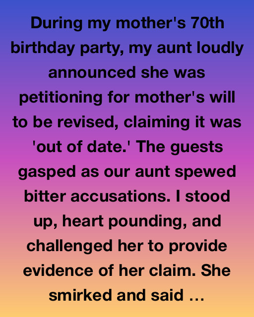 During my mother’s 70th birthday party, my aunt loudly announced she was petitioning for mother’s will to be revised, claiming it was ‘out of date.’ The guests gasped as our aunt spewed bitter accusations. I stood up, heart pounding, and challenged her to provide evidence of her claim. She smirked and said the will had not been amended in two decades, implying hidden secrets were nestled within the yellowing pages.