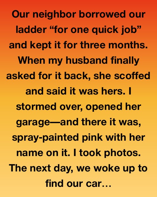 Our neighbor borrowed our ladder โfor one quick jobโ and kept it for three months. When my husband finally asked for it back, she scoffed and said it was hers. I stormed over, opened her garageโand there it was, sprayโpainted pink with her name on it. I took photos.