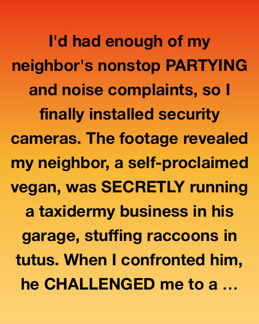 I’d had enough of my neighbor’s nonstop PARTYING and noise complaints, so I finally installed security cameras. The footage revealed my neighbor, a self-proclaimed vegan, was SECRETLY running a taxidermy business in his garage, stuffing raccoons in tutus.