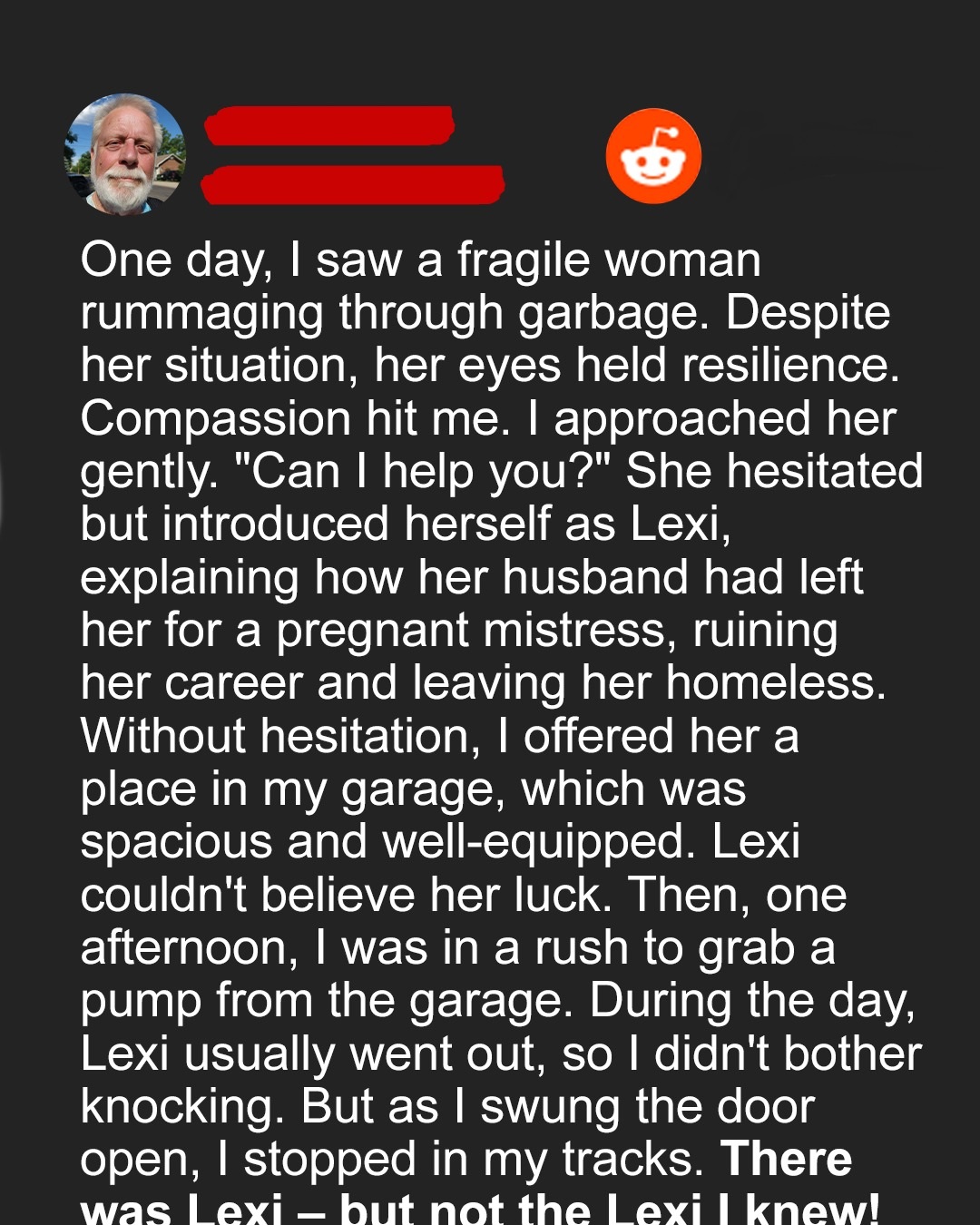 Compassion hit me. I approached her gently. “Can I help you?” She hesitated but introduced herself as Lexi, explaining how her husband had left her for a pregnant mistress, ruining her career and leaving her homeless. Without hesitation, I offered her a place in my garage, which was spacious and well-equipped. Lexi couldn’t believe her luck.
