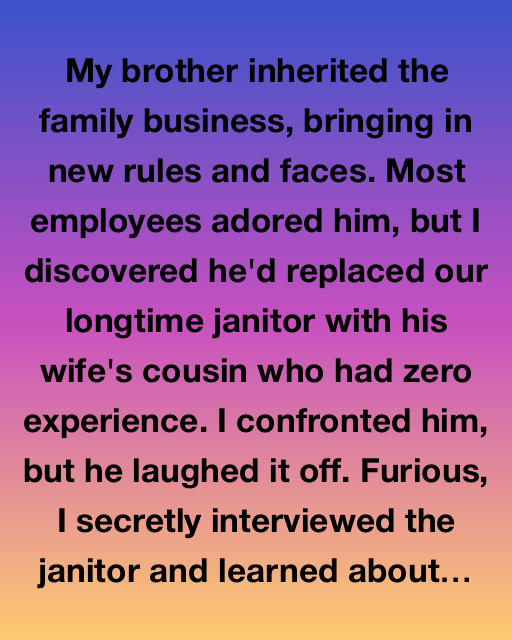 My brother inherited the family business, bringing in new rules and faces. Most employees adored him, but I discovered he’d replaced our longtime janitor with his wife’s cousin who had zero experience. I confronted him, but he laughed it off. Furious, I secretly interviewed the janitor and learned about his struggles and dedication.