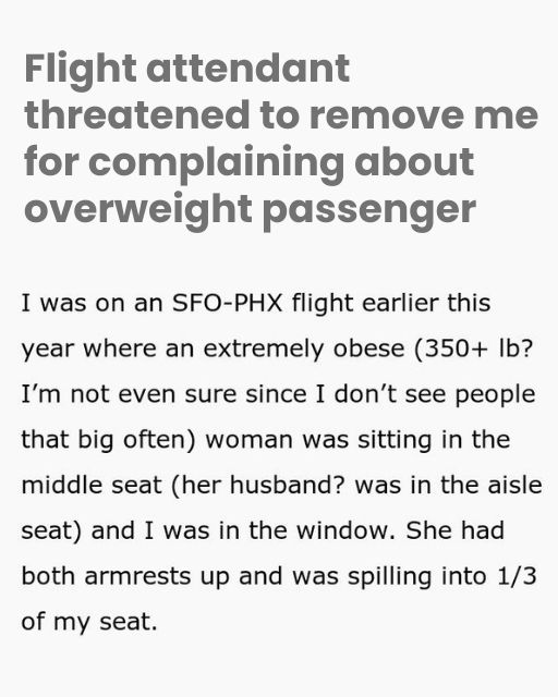 I knew it was going to be a bad flight as soon as I got to my row. I had the window seat, which I was happy about, but the woman in the middle seat was already spilling over into it. Iโm not talking a little bit. Iโm talking a solid third of my space was justโฆ gone. Both armrests were up, swallowed by her side. Her husband, or maybe just travel partner, was on the aisle, looking straight ahead like nothing was wrong.