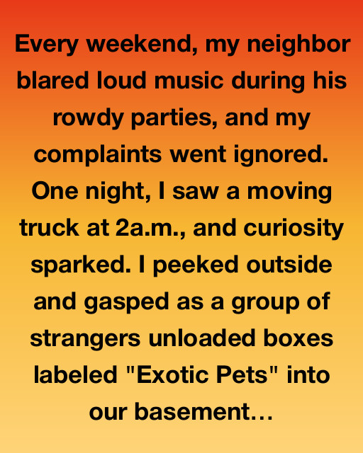 Every weekend, my neighbor blared loud music during his rowdy parties, and my complaints went ignored. One night, I saw a moving truck at 2 a.m., and curiosity sparked. I peeked outside and gasped as a group of strangers unloaded boxes labeled “Exotic Pets” into our basement.