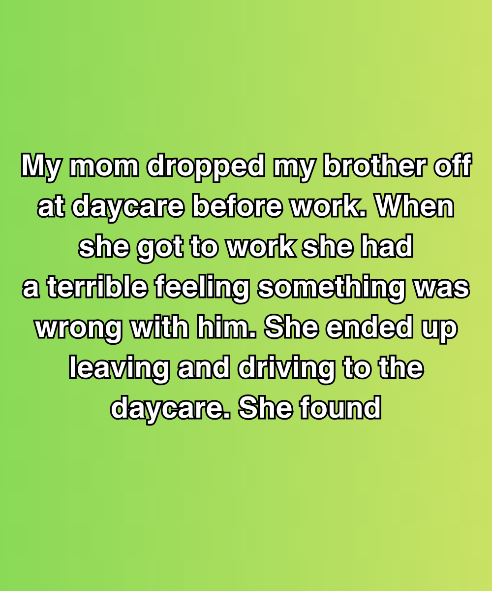 My mom dropped my brother off at daycare before work. When she got to work, she had a terrible feeling something was wrong with him. She ended up leaving and driving to the daycare. She found his lunchbox still in the car.