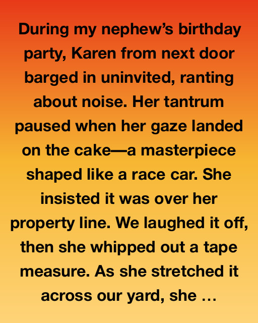 During my nephew’s birthday party, Karen from next door barged in uninvited, ranting about noise. Her tantrum paused when her gaze landed on the cake—a masterpiece shaped like a race car. She insisted it was over her property line. We laughed it off, then she whipped out a tape measure. As she stretched it across our yard, she stumbled, her face turning a shade redder than her fiery hair.
