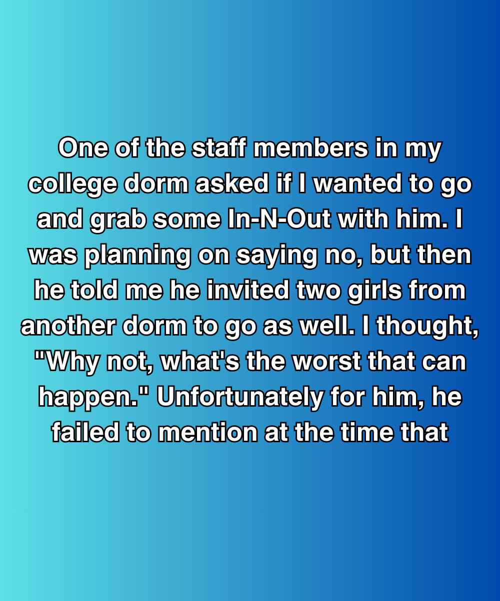 One of the staff members in my college dorm asked if I wanted to go and grab some In-N-Out with him. I was planning on saying no, but then he told me he invited two girls from another dorm to go as well. I thought, “Why not, what’s the worst that can happen.” Unfortunately for him, he failed to mention at the time that one of the girls he invited was his ex.