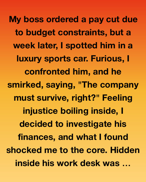 My boss ordered a pay cut due to budget constraints, but a week later, I spotted him in a luxury sports car. Furious, I confronted him, and he smirked, saying, “The company must survive, right?” Feeling injustice boiling inside, I decided to investigate his finances, and what I found shocked me to the core. Hidden inside his work desk was a small, locked box that piqued my curiosity.