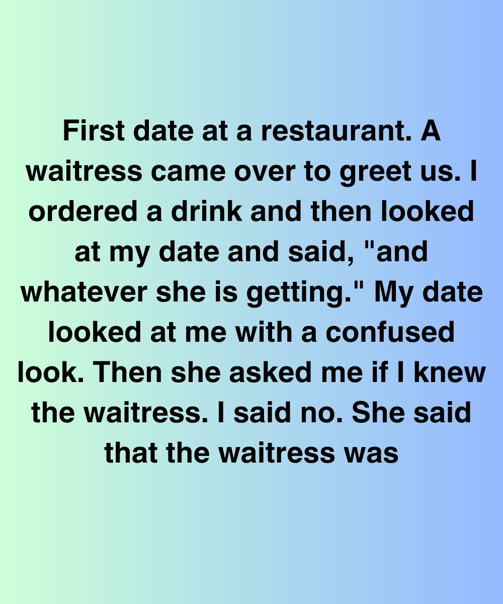 First date at a restaurant. A waitress came over to greet us. I ordered a drink and then looked at my date and said, “and whatever she is getting.” My date looked at me with a confused look. Then she asked me if I knew the waitress. I said no. She said that the waitress was looking at me like she did.