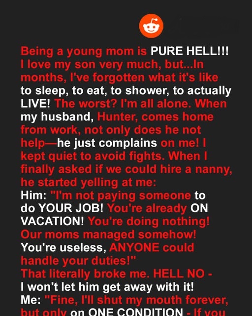 “Being a young mom is PURE HELL!!! I love my son very much, but… In months, I’ve forgotten what it’s like to sleep, to eat, to shower, to actually LIVE! The worst? I’m all alone. When my husband, Hunter, comes home from work, not only does he not help—he just complains on me! I kept quiet to avoid fights. When I finally asked if we could hire a nanny, he started yelling at me: