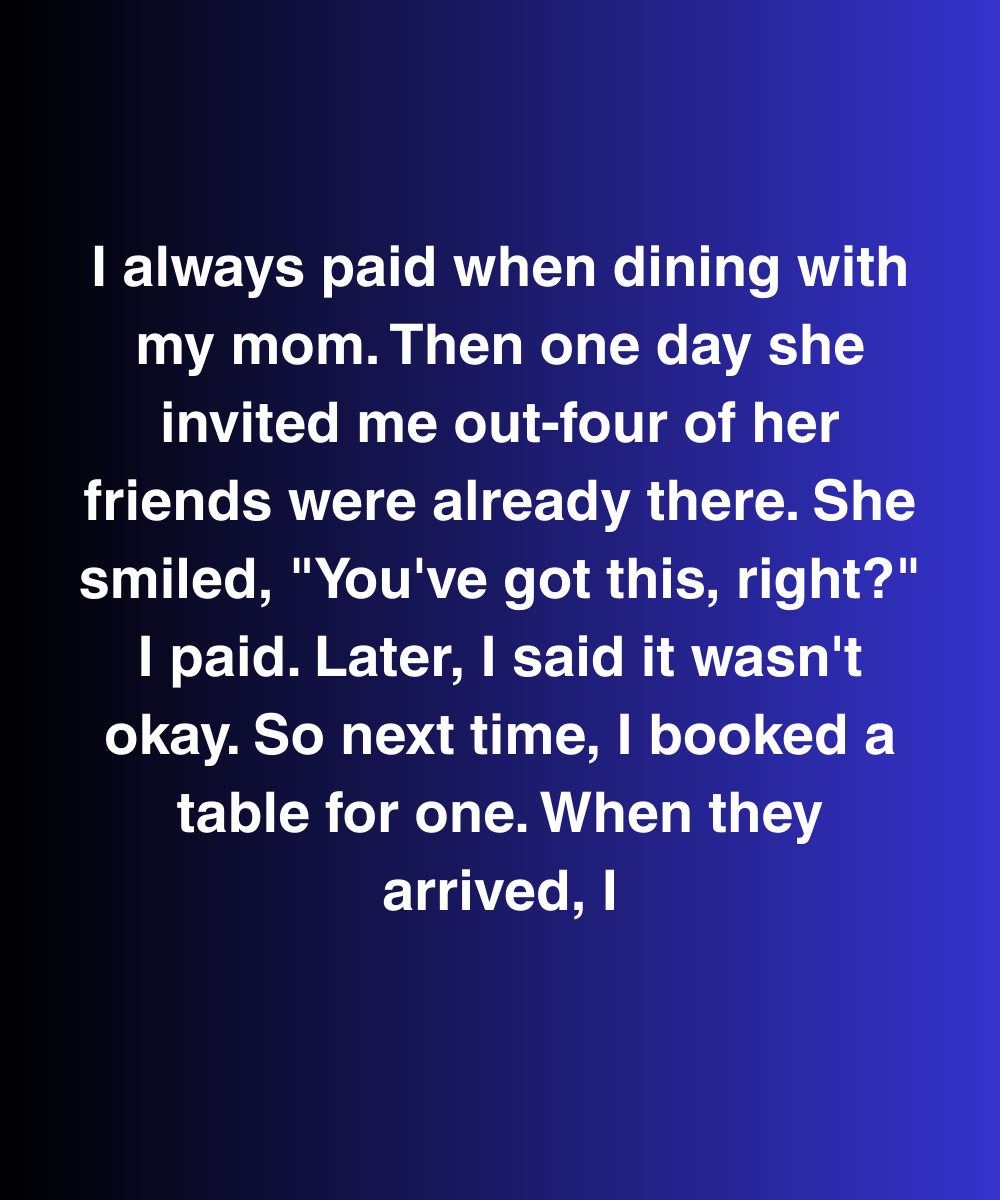 I always paid when dining with my mom. Then one day she invited me out—four of her friends were already there. She smiled, “You’ve got this, right?” I paid. Later, I said it wasn’t okay. So next time, I booked a table for one. When they arrived, I…