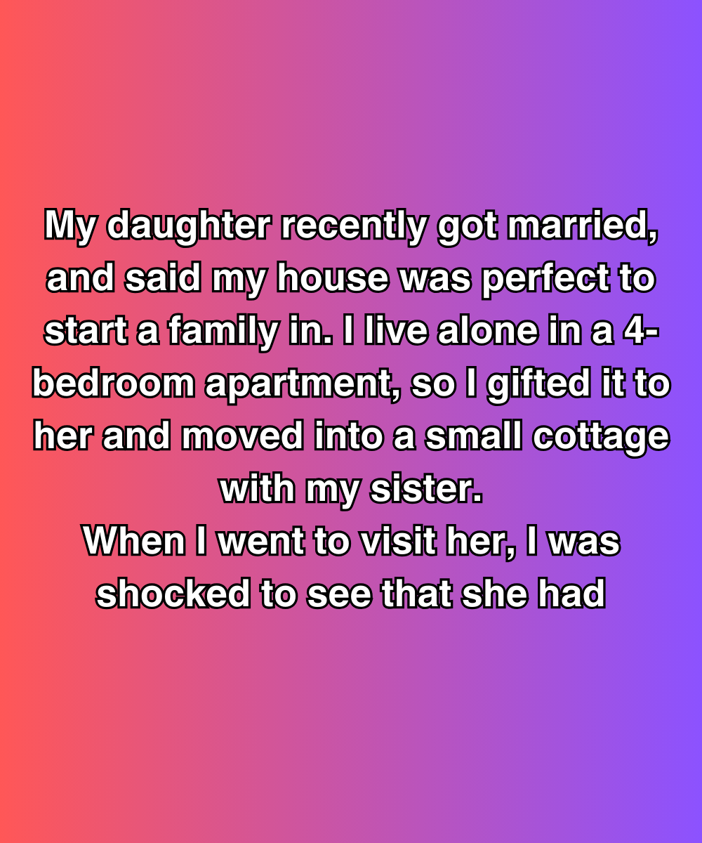 My daughter recently got married, and said my house was perfect to start a family in. I live alone in a 4-bedroom apartment, so I gifted it to her and moved into a small cottage with my sister. When I went to visit her, I was shocked to see that she had painted the living room neon orange and covered the hardwood floors with cheap carpet squares.