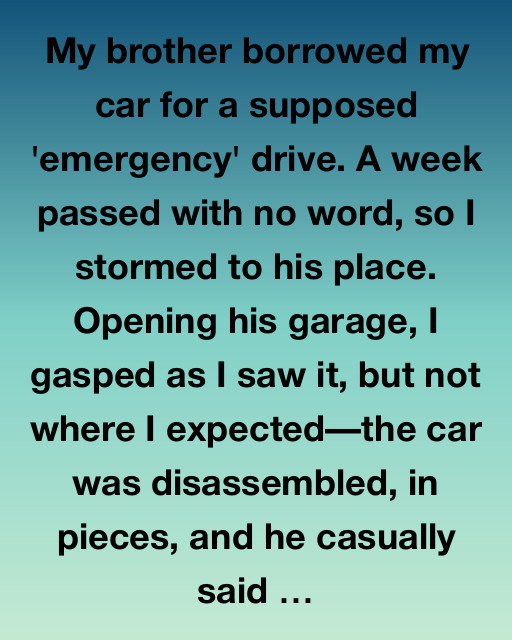 My brother borrowed my car for a supposed ’emergency’ drive. A week passed with no word, so I stormed to his place. Opening his garage, I gasped as I saw it, but not where I expected—the car was disassembled, in pieces, and he casually said it was a surprise. He grinned at my horror and promised it was all part of a bigger plan.