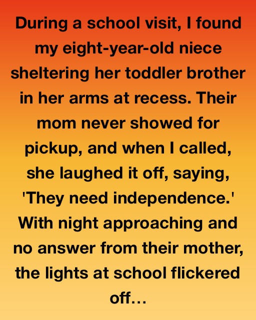 During a school visit, I found my eight-year-old niece sheltering her toddler brother in her arms at recess. Their mom never showed for pickup, and when I called, she laughed it off, saying, ‘They need independence.’ With night approaching and no answer from their mother, the lights at school flickered off, leaving us unsure what to do next.