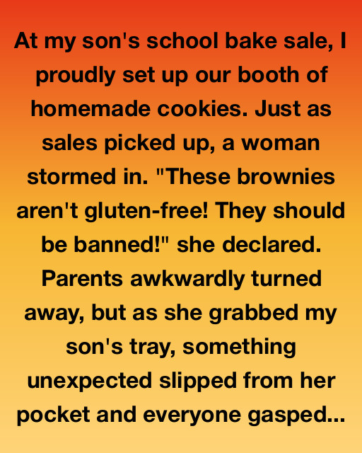 At my son’s school bake sale, I proudly set up our booth of homemade cookies. Just as sales picked up, a woman stormed in. “These brownies aren’t gluten-free! They should be banned!” she declared. Parents awkwardly turned away, but as she grabbed my son’s tray, something unexpected slipped from her pocket and everyone gasped.