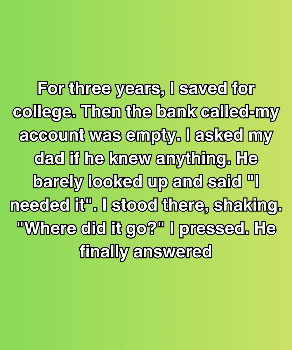 “For three years, I saved for college. Then the bank called—my account was empty. I asked my dad if he knew anything. He barely looked up and said, ‘I needed it.’ I stood there, shaking. ‘Where did it go?’ I pressed. He finally answered, ‘To fix what I broke.’”