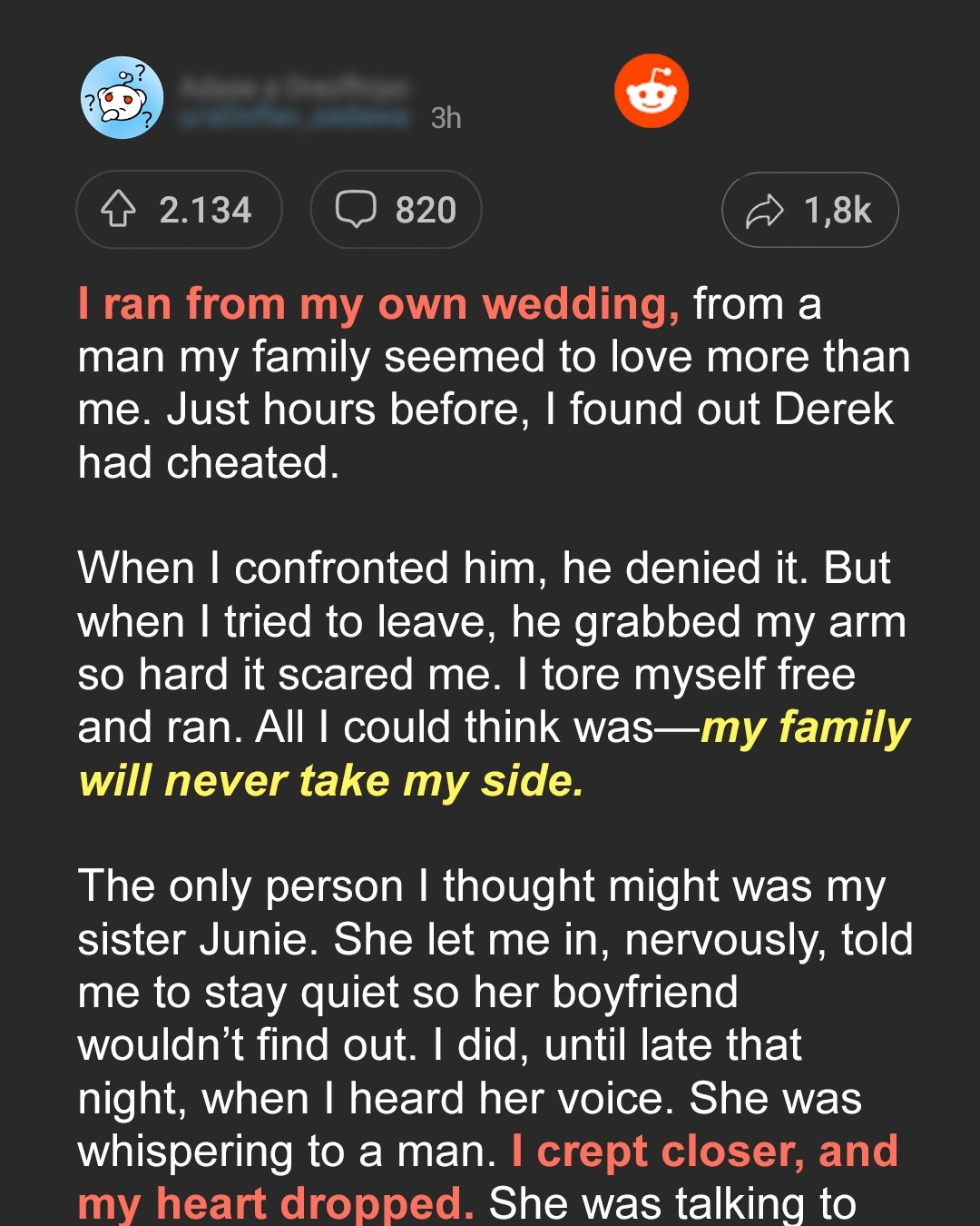 I ran from my own wedding, from a man my family seemed to love more than me. Just hours before, I found out Derek had cheated.