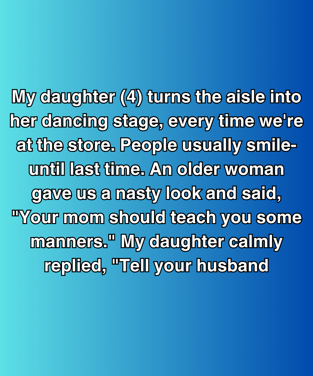 My daughter (4) turns the aisle into her dancing stage, every time we’re at the store. People usually smile—until last time. An older woman gave us a nasty look and said, “Your mom should teach you some manners.” My daughter calmly replied, “Tell your husband.”