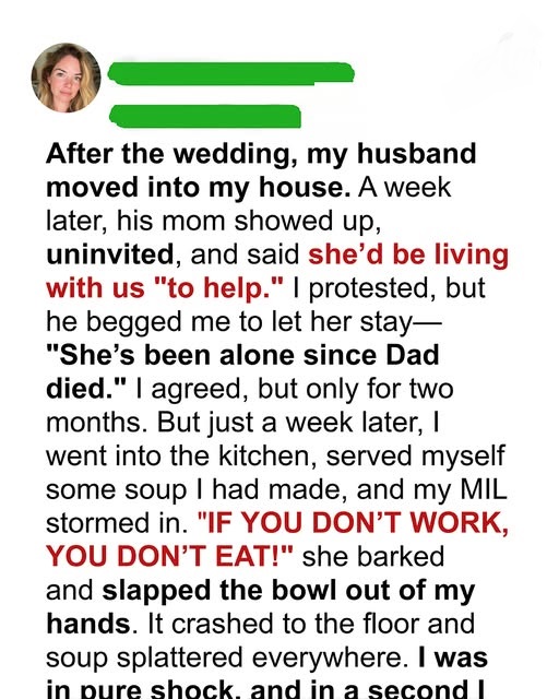 After the wedding, my husband moved into my house. A week later, his mom showed up, uninvited, and said she’d be living with us “to help.” I protested, but he begged me to let her stay—“She’s been alone since Dad died.” I agreed, but only for two months. But just a week later, I went into the kitchen, served myself some soup I had made, and my MIL stormed in.