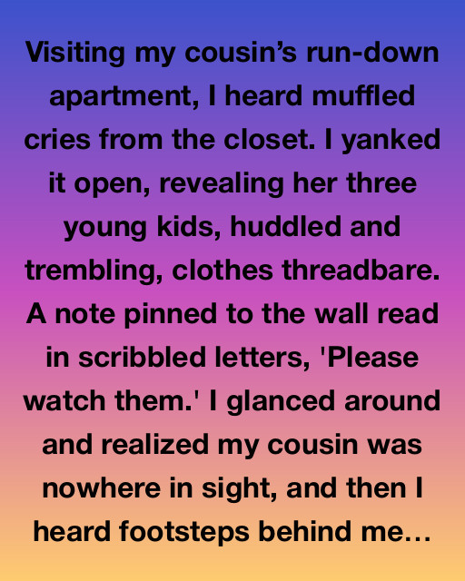 Visiting my cousin’s run-down apartment, I heard muffled cries from the closet. I yanked it open, revealing her three young kids, huddled and trembling, clothes threadbare. A note pinned to the wall read in scribbled letters, ‘Please watch them.’ I glanced around and realized my cousin was nowhere in sight, and then I heard footsteps behind me.