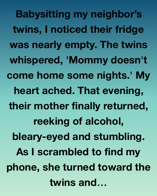 Babysitting my neighbor’s twins, I noticed their fridge was nearly empty. The twins whispered, ‘Mommy doesn’t come home some nights.’ My heart ached. That evening, their mother finally returned, reeking of alcohol, bleary-eyed and stumbling. As I scrambled to find my phone, she turned toward the twins and tried to smile, though her eyes couldn’t hide her tiredness or guilt.