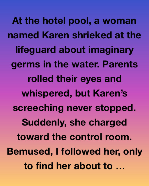 At the hotel pool, a woman named Karen shrieked at the lifeguard about imaginary germs in the water. Parents rolled their eyes and whispered, but Karen’s screeching never stopped. Suddenly, she charged toward the control room. Bemused, I followed her, only to find her about to press a big red button marked ‘Emergency Drain.’ The lifeguard quickly intervened, asking her to calm down, explaining that pressing the button would empty the entire pool and cause chaos. Karen hesitated, her face flushed with frustration, yet a flicker of doubt crossed her eyes.