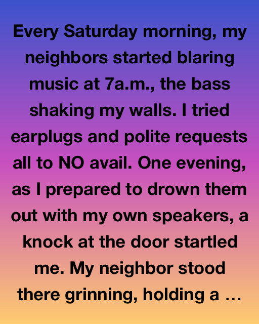 Every Saturday morning, my neighbors started blaring music at 7 a.m., the bass shaking my walls. I tried earplugs and polite requests all to NO avail. One evening, as I prepared to drown them out with my own speakers, a knock at the door startled me. My neighbor stood there grinning, holding a blueberry pie. “I thought it might be a delicious way to say hello,” he said, extending the pie toward me.
