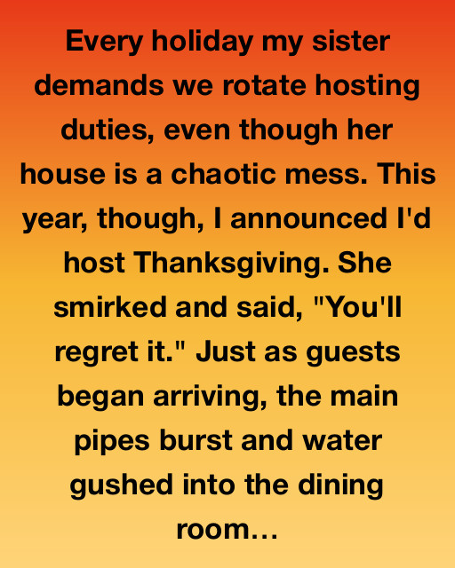 Every holiday my sister demands we rotate hosting duties, even though her house is a chaotic mess. This year, though, I announced I’d host Thanksgiving. She smirked and said, “You’ll regret it.” Just as guests began arriving, the main pipes burst and water gushed into the dining room.