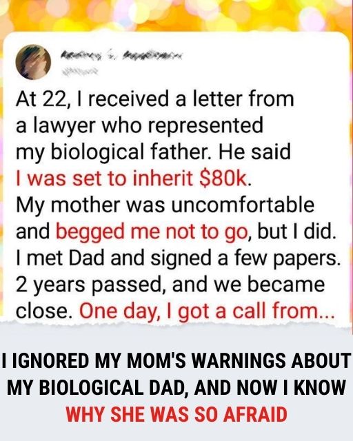 When I was 22, a letter from a lawyer turned my world upside down. It said my biological father, a man I’d never known, wanted me to inherit $80,000. My mom was furious and scared. She begged me not to meet him, telling me that some doors are meant to stay closed and that his money was poison. I figured she was just bitter about the past, so I ignored her.